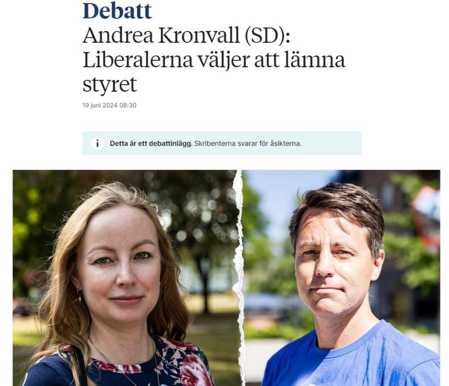 Det är med stor besvikelse jag och SD Norrtälje har nåtts av beskedet att Liberalerna beslutat att bryta samarbetsavtalet och samarbetet med hela det högerstyre som bestått av Moderaterna, Sverigedemokraterna, Liberalerna och Kristdemokraterna sedan 2022. Genom sitt agerande sviker Liberalerna Norrtäljes högerväljare och det förtroende som givits.