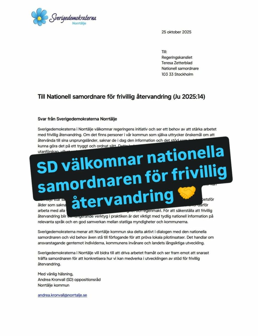 Sverigedemokraterna i Norrtälje vill bidra till att driva arbetet framåt och ser fram emot att snarast träffa samordnaren för att konkretisera hur vi kan medverka i utvecklingen av stöd för frivillig återvandring.
