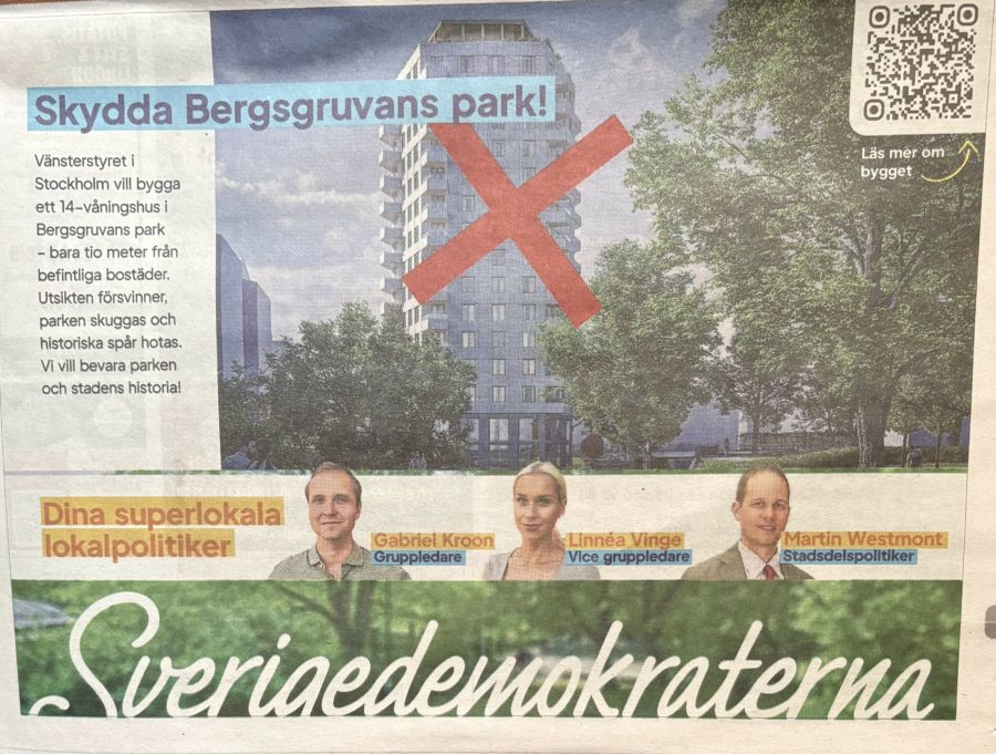 Sverigedemokraterna fortsätter att kämpa för att stockholmarnas uppskattade parkmiljöer ska få vara kvar. Den rödgröna majoriteten vill tyvärr annat, de vill bland annat bygga ett höghus i Bergsgruvans park på Södermalm. Tillsammans är vi starka och tillsammans kan vi se till att bevara våra gröna lungor i vår stad.